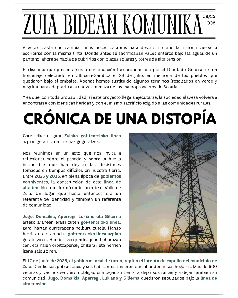 Desde Zuia Bidean, trabajamos cada día para frenar los macroproyectos energéticos que amenazan nuestro entorno natural, nuestro modo de vida y el futuro de nuestras comunidades. Creemos en una transición energética justa, descentralizada y respetuosa con la tierra y las personas.